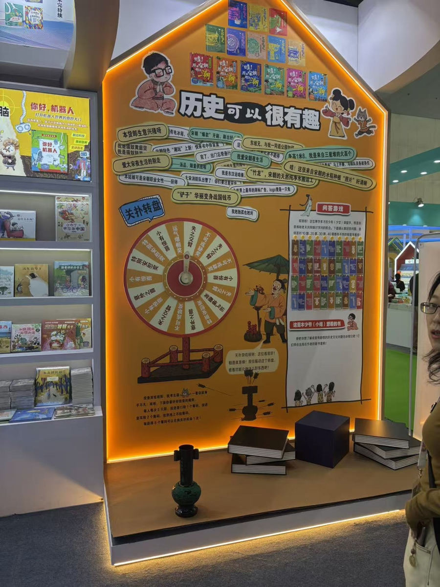 在新蕾出版社展位,传统的“关扑”游戏转盘吸引了不少观众互动。“历史可以很有趣!”副总编辑高雅介绍,此次带来的《文物中国史》博物馆系列新书,由拥有二十多年博物馆工作经验的“朋朋哥哥”撰写,以文物为载体讲述历史,从国宝的工艺、发掘历程等细节入手,激发孩子们对中国传统文化的兴趣与热爱。